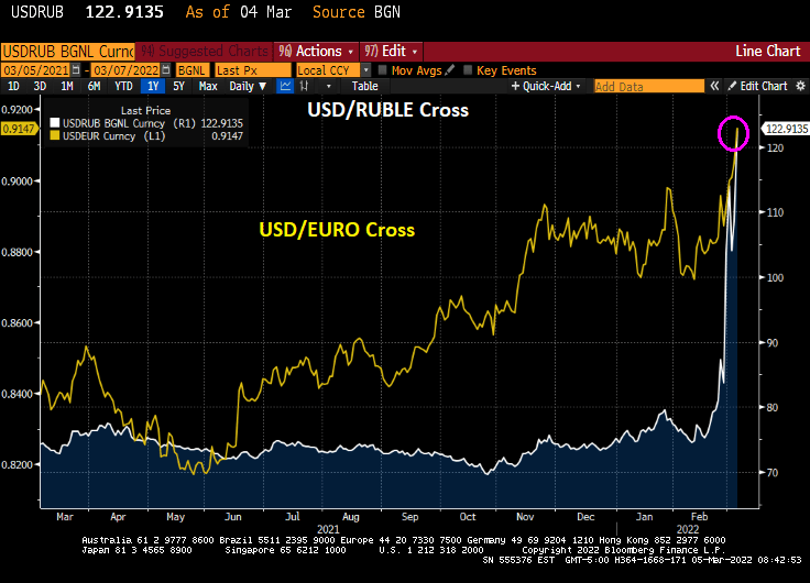 The USD/Russian Ruble cross is skyrocketing and the USD/Euro is doing likewise. Russians visiting the US will find that their trip is suddenly unaffordable (as do many American citizens will its rampant inflation). As Bruce Willis said in “Die Hard,” “Welcome to the party, pal.”