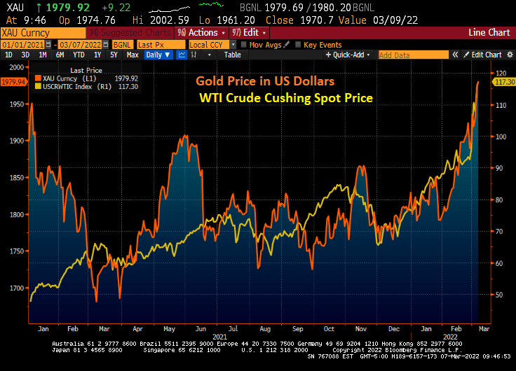 WTI Crude Oil spot price was up 91% from the beginning of 2021 to the Russian invasion of Ukraine. Now it is up 142% thanks to the invasion of Ukraine.