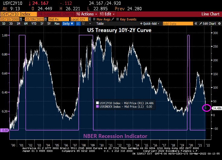 The US Treasury 10Y-2Y curve continues to flatten and is the worst curve recovery in modern history.
