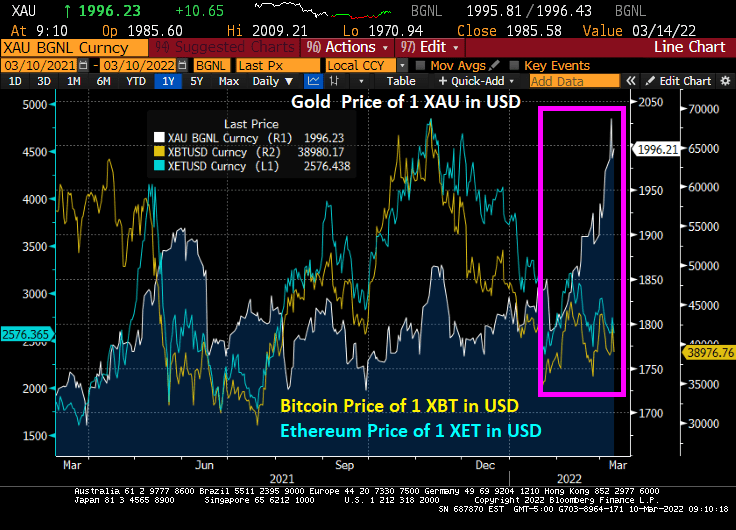 Gold has been climbing as Russia invades Ukraine. Cryptos Bitcoin and Ethereum are steady, even as the Biden Administration issues an executive order to “study” cryptocurrencies.