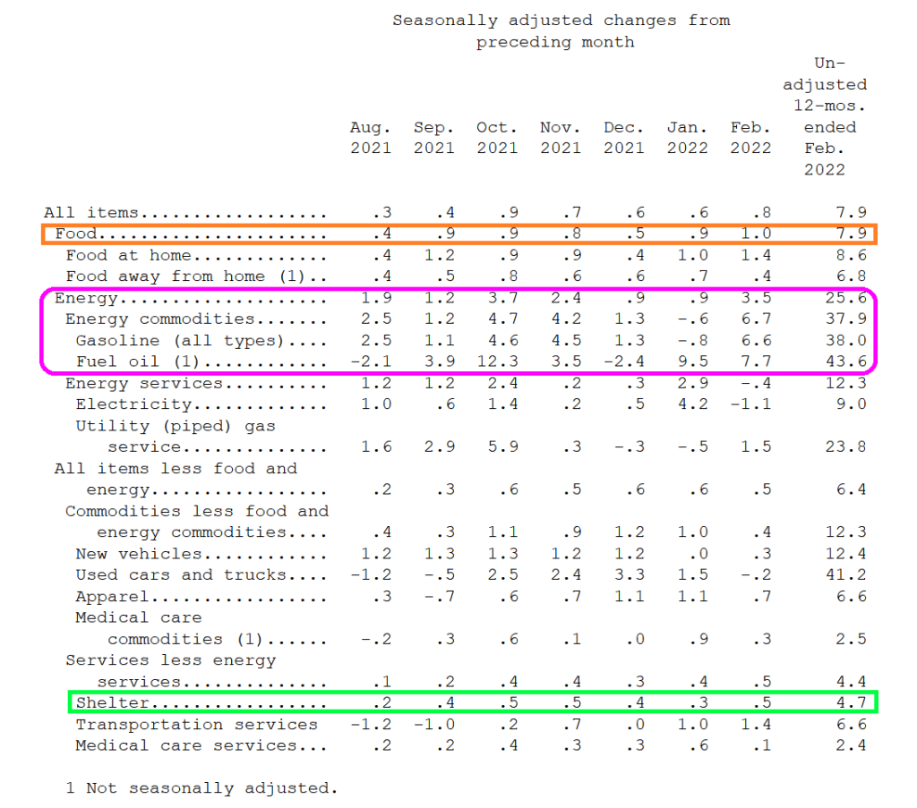 Energy costs soared in February YoY. Gasoline was up 38%. Fuel Oil was up 43.6%. Food was up 7.9%.