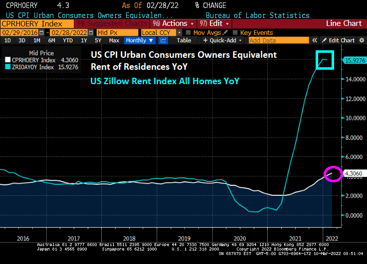 US rent inflation (owner’s equivalent rent of residence YoY) surged to 4.30%. However, Zillow’s rent index last month was 15.93% YoY.