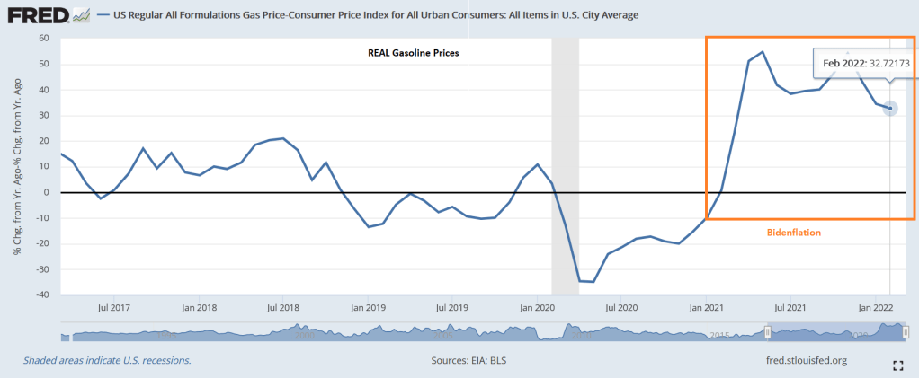 REAL gasoline prices (nominal gasoline prices less inflation) are up 32.72% YoY in February.