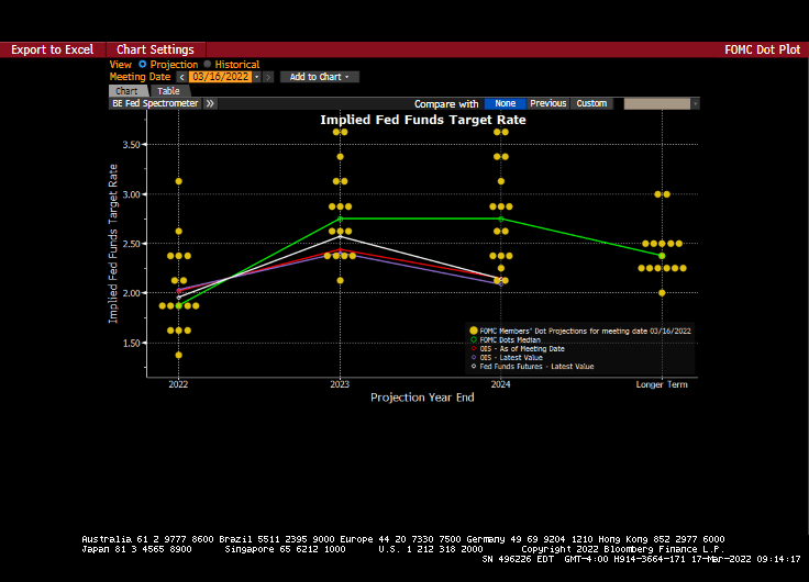 But if we look at the Fed DOTS plot, we see a rise in The Fed Funds Target rate in 2022 (7 rate hikes), more rate hikes in 2023 and 2024 and then a slowing in the longer term (as if voting members have a clue about the long-run economy).