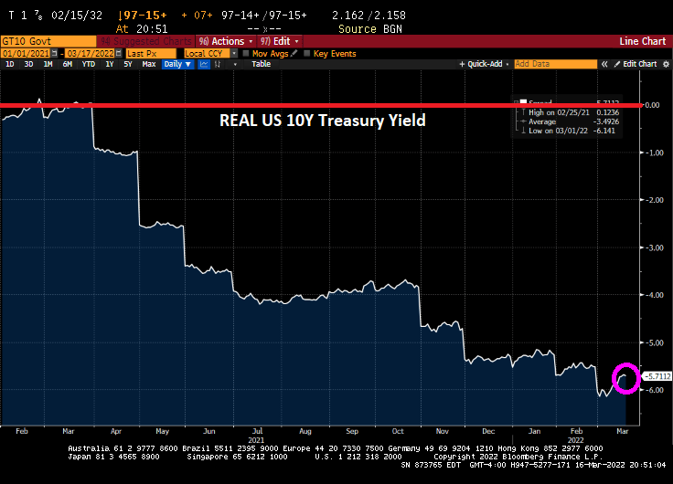 Well, Powell and The Fed Gang failed to tackle inflation with its 25 basis point increase in their target rate. The result? Inflation is still roaring and REAL Treasury yields remain NEGATIVE (nominal Treasury yields – inflation).