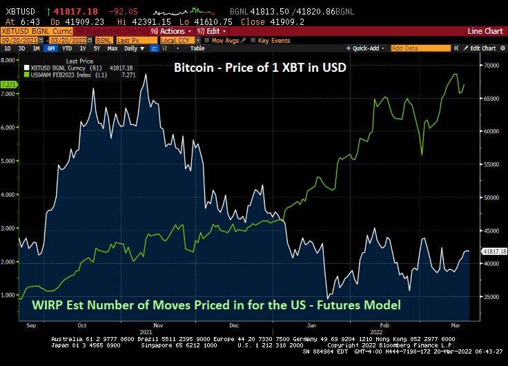 At last look, The Federal Reserve is forecast to raise their target rate 7 times over the coming year. And with the increasing forecast of rate hikes, we are seeing the cryptocurrency Bitcoin fall from near $70,000 to $41,817.