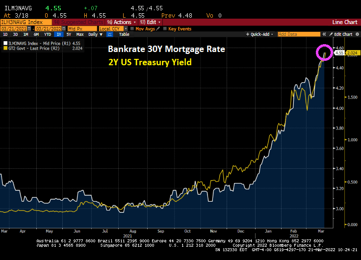 Bankrate’s 30-year mortgage rate keeps on climbing and has hit 4.55% as the 2-year Treasury yield rises rapidly.