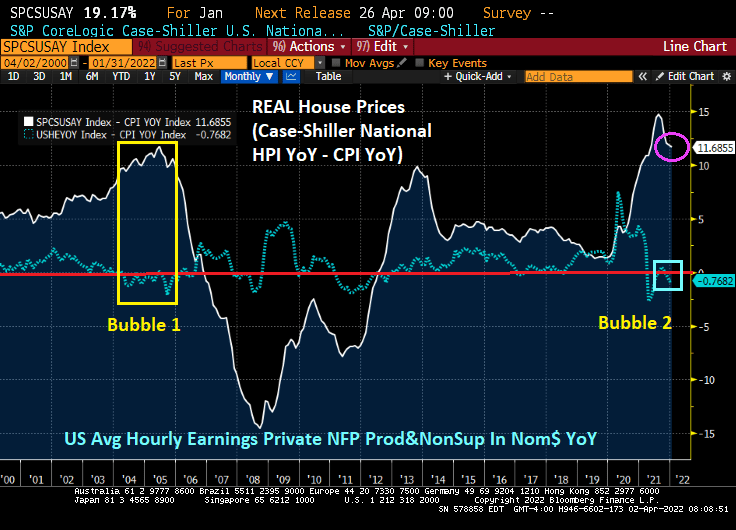 The Dallas Federal Reserve issued a warning recently that a housing bubble is brewing … after the economy drank its magic monetary elixir. We can see the housing bubble clearly (defined as the spread between REAL home price growth and REAL average hourly earnings). Notice that the current housing bubble looks similar to the infamous 2005 housing bubble. And the US is seeing several months of the spread between REAL home price growth and REAL hourly earnings be even higher than the peak of the 2005 bubble.