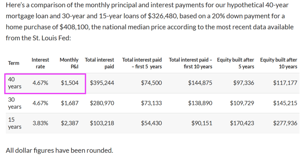To make a long story short, a 40-year mortgage, by stretching the payment out from 30 to 40 years, means that the mortgage mortgage payment declines from $1,687 to $1,504.
