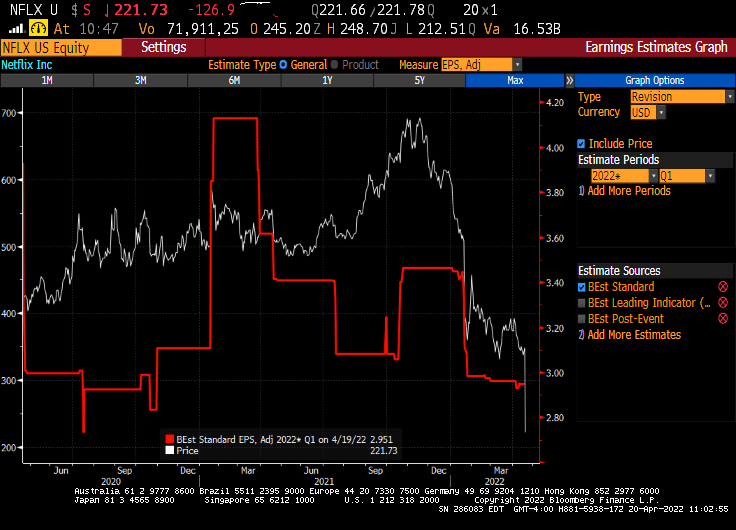 Netflix’ earnings per share soared when Biden was first installed as President, likely due to effects of Biden’s/Pelosi’s/Schumer’s Covid stimulus. But alas, fiscal stimulus is short-lived but the negative effects of inflation are long-lasting.