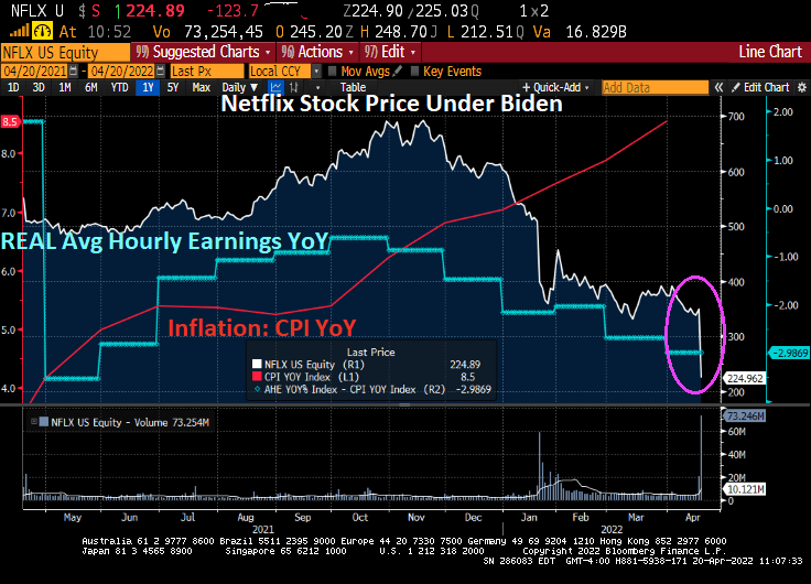 Netflix, the movie and TV show subscription service, suffered an extraordinary decline in its stock price. But like the film “Margin Call” that pretends the Lehman Brothers bankruptcy in 2008 was a surprise, it really is no surprise that Netflix is getting crushed. Why? Thanks to Bidenflation, millions of American households are suffering (REAL average hourly earnings are declining under Biden) and many of those were Netflix subscribers.