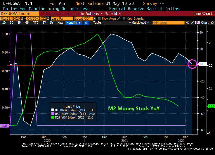 However, as M2 Money growth has slowed 11%, the Dallas Fed manufacturing outlook has plunged to near zero.