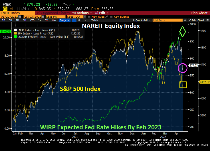 As The Federal Reserve seems hellbent on raising interest rates to fight the rapid increases caused by Biden’s follicies, we see the S&P 500 index taking a hit in 2022, but NAREIT’s all equity index as well.