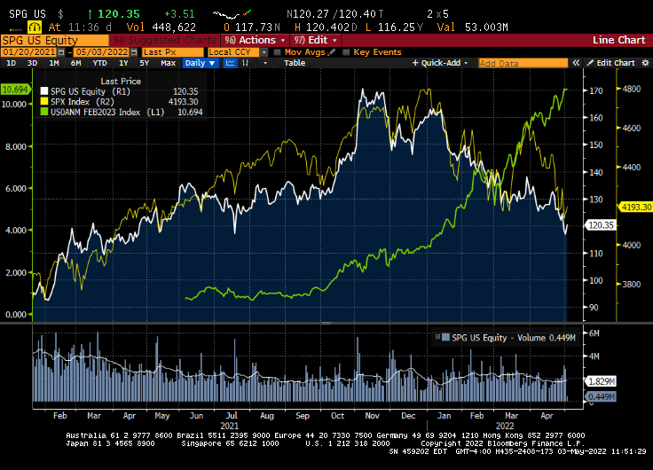Meanwhile, Simon Properties equity has declined along with the S&P 500 index as The Fed raises rates. In other words, both the S&P 500 and shopping mall REITs are getting “Fauci’d” by The Fed. Or Powell’d.