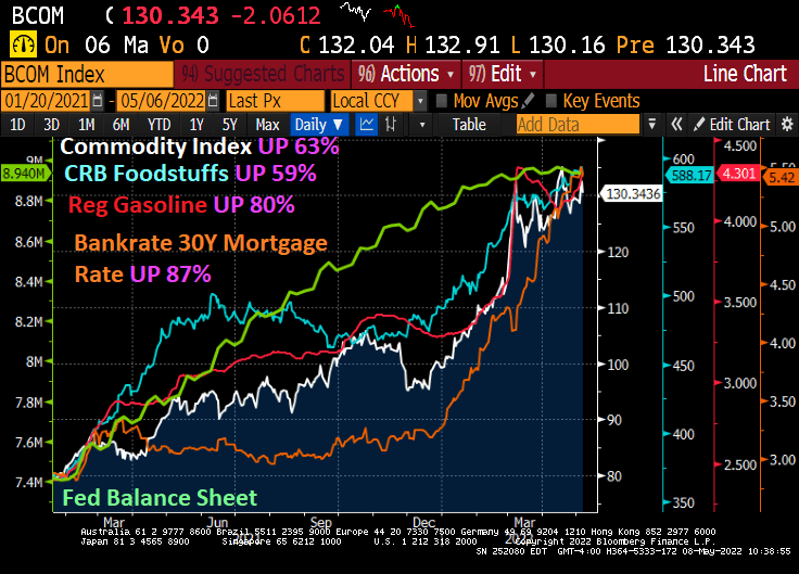 Since Obama’s 3rd term as President (aka, Biden’s installation as President on January 20, 2021), mortgage rates have risen 87%, regular gasoline prices have risen 80%, CRB foodstuffs are up 59% and Commodities are up 63%.