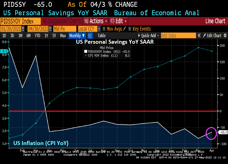 Yes, inflation really bites. In fact, as US inflation is near the 40-year high, US personal savings declined -65% YoY as consumers try to cope with rising prices.