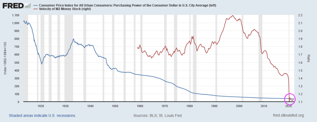 And yes, the purchasing power of the US Dollar and M2 Money Velocity (GDP/M2) appear to be collapsing like a dying star.