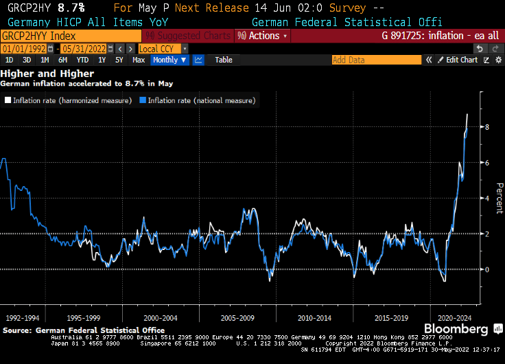 Driven by soaring energy and food costs, this morning’s data showed consumer prices in Europe’s largest economy surged 8.7% YoY – far hotter than the +8.1% expected (the highest since the start of the monthly statistics in 1963).