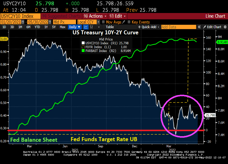 While US markets are closed today in honor of Memorial Day, the US Treasury curve (10Y-2Y) has stabilized at 25.8 basis points after the initial shock of The Fed finally raising rates for the first time under Biden.