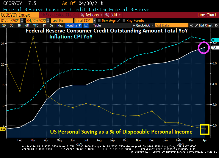 In related news (debt), consumer debt is rising at 7.5% YoY while the personal savings rate plunged to 4.4% in May as consumers borrow more and save less to cope with inflation.