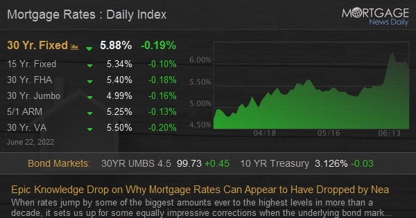 According to Mortgage News Daily, the 30-year fixed dropped below 6% to 5.88%.