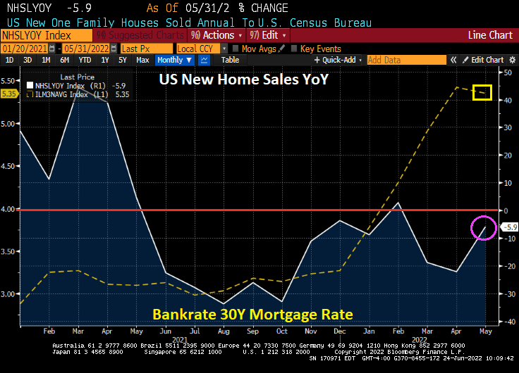 Thanks to massive Fed monetary stimulus still stalking the housing market, US new home sales rose +10.7% MoM (from April to May), but were down -5.9% YoY (from May 2021 to May 2022) as mortgage rates rose.