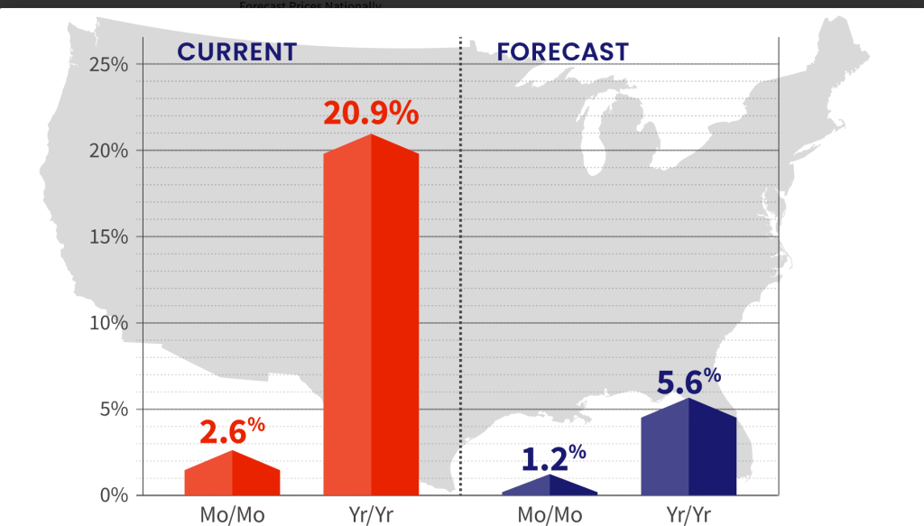 In May, CoreLogic’s national home price index was up 20.9% YoY. But home prices are expected to grow at a 5.6% clip over the coming year.