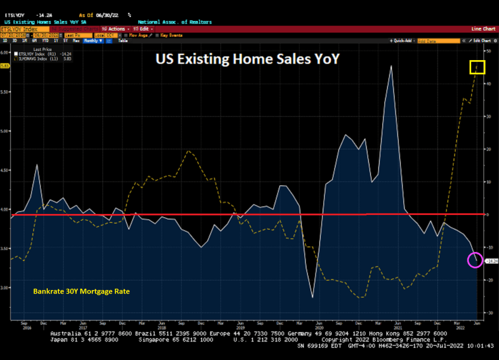 US existing home sales crashed -14.24% YoY and -5.40% MoM in June as The Fed tightens its icy grip on the housing market. Existing home sales were lower than expected at 5.12 million home sold SAAR.