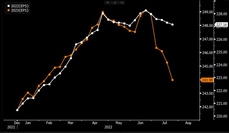 S&P 500 2023 EPS expectations falling off a cliff (orange line).