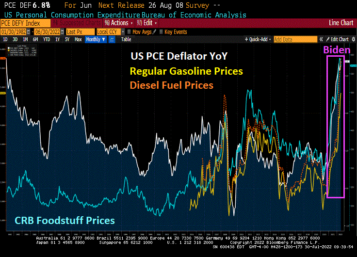 US inflation, based on June’s Personal Consumption Expenditures (PCE) deflator, rose to its highest level since 1982. The PCE Deflator YoY rose to 6.8% while the core PCE deflator (less food and energy, the two things more households care about) rose to 4.8% YoY in June.