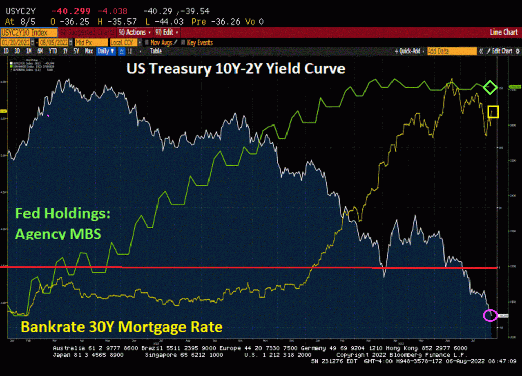 The current US Treasury 10Y-2Y yield curve just slipped further into reversion at -40.299 basis points, screaming impending recession. Oddly, The Federal Reserve has been leaving its balance sheet of Agency Mortgage-backed Securities (MBS) in tact (green line).