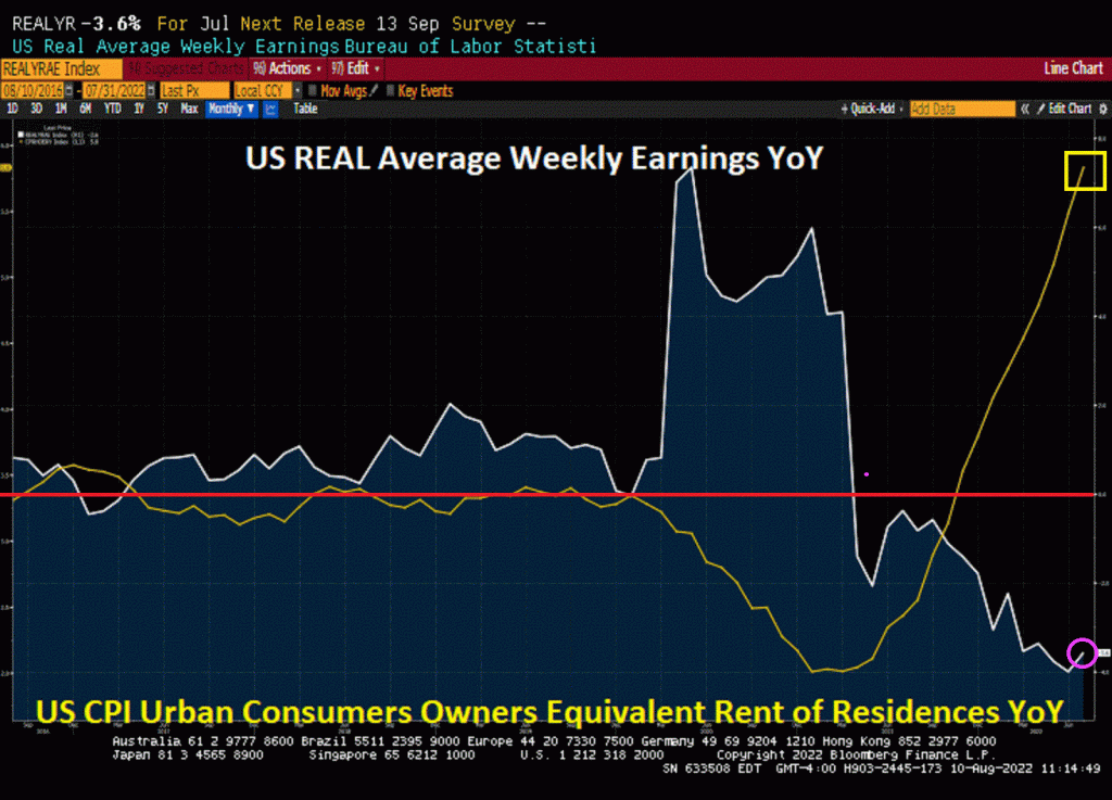 The midterm elections are approaching fast and, of course, Biden and his crew have to put the best face of his and the Democrats accomplishments. But seriously Joe, REAL weekly earnings growth is negative meaning that inflation is crushing wage growth. Meanwhile, CPI rent is skyrocketing and was 5.8% YoY in July.