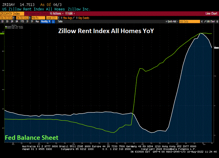 As we know, the CPI measure of rent is terrible and does not reflect the actual rise in rents. Zillow’s Rent index YoY is slowing, but remains at 14.75% YoY, far higher than the CPI rent measure of 5.8%.