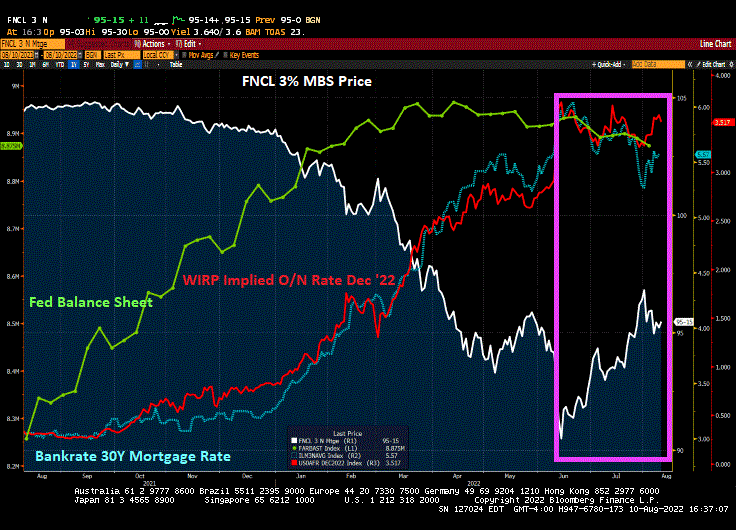 Agency mortgage-backed securities (MBS) prices started to degrade as The Federal Reserve started to try to combat inflation caused by Biden’s energy policies and rampant Federal spending. That is, under June when the implied Fed O/N rate (red line) cooled and the 30-year mortgage rate (blue line) has come down a little.