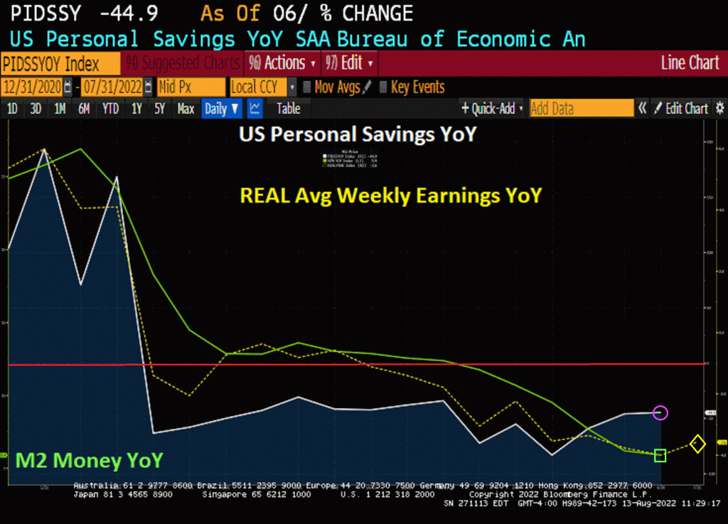 Well, Michael Burry is correct. In June, the US Personal Savings Rate YoY clocked-in at -44.9%. But the personal savings rate YoY has been negative since April 2021. Add to that the miserable REAL Average Weekly Earnings YoY on Americans and we have a serious problem.