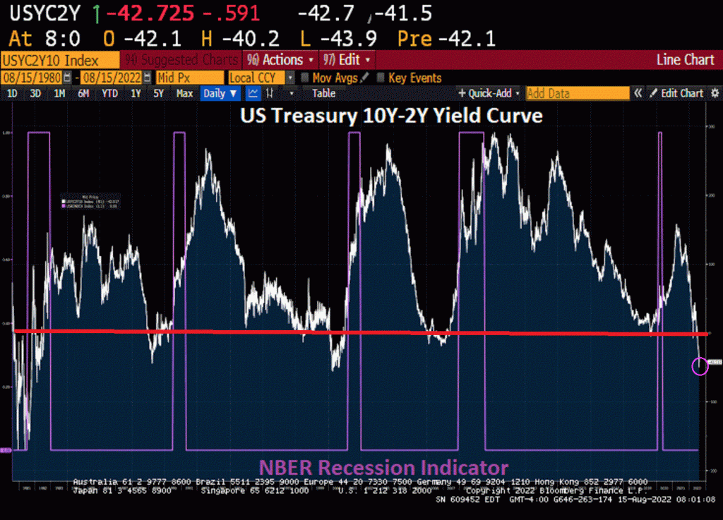 So, here we sit. This morning, the US Treasury yield curve (10Y-2Y) remains inverted. This AM, the curve inverted another -.591 basis points to -42.725, a sign of impending recession.