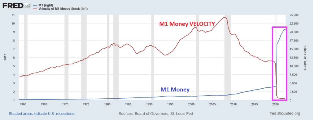 One truly horrific chart is that of M1 Money and M1 Money Velocity (M1/GDP). M1 Money surged with Covid driving M1 Money Velocity down to levels never seem before.