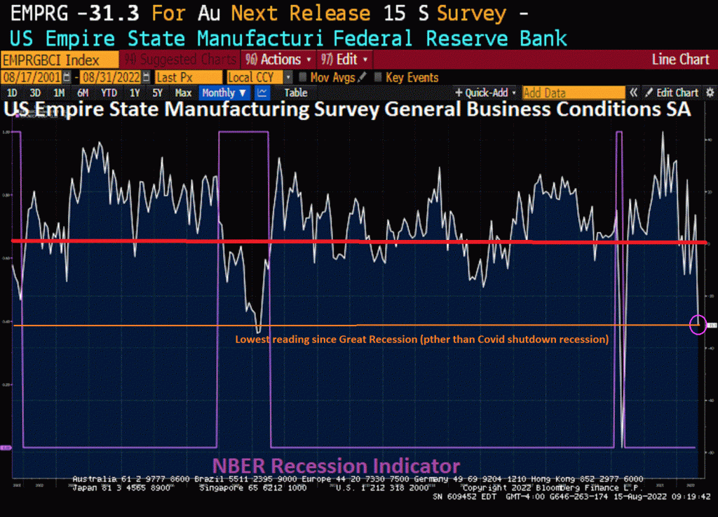 The US Empire State Manufacturing Survey General Business Conditions, that is. It just crashed and burned (-31.3) in August, the lowest reading since The Great Covid Shutdown and before that The Great Recession.