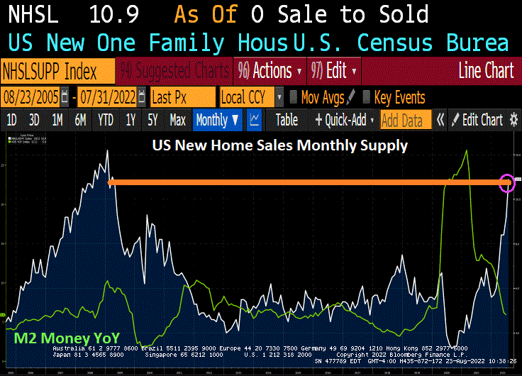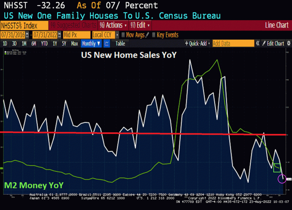 July’s New Home Sales crashed and burned. At -32.26% YoY. This is happening as M2 Money growth has declined.