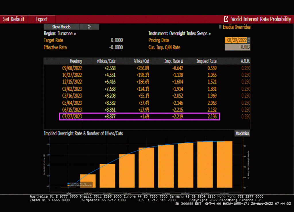 But it is in Europe where Lagarde and company where the REAL action was. The ECB’s target rate is at 0% with a negative effective rate of -0.08%. But the ECB is expected to keep raising their target rate to 2.136% by July 2023.