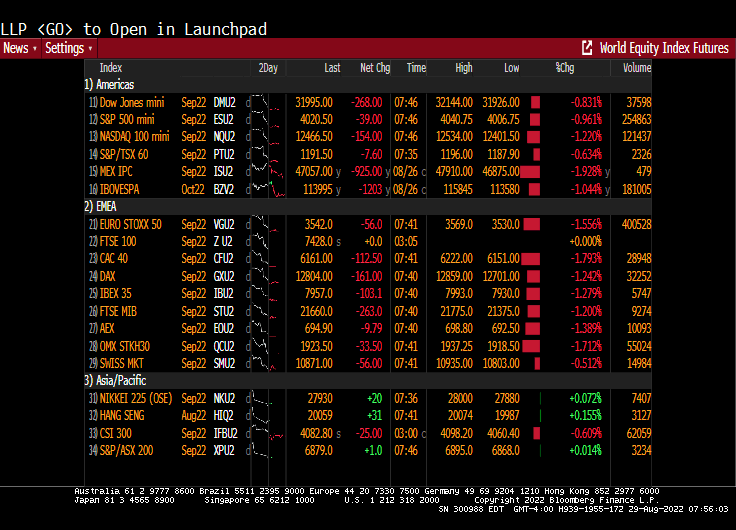 Almost every equity benchmark tumbled in Asia trading Monday as the fallout from the Fed’s hawkish rhetoric ripped through markets. S&P 500 futures dropped as much as 1.3%, indicating that US stocks are poised to extend a rout that saw the index erase $1.2 trillion on Friday.