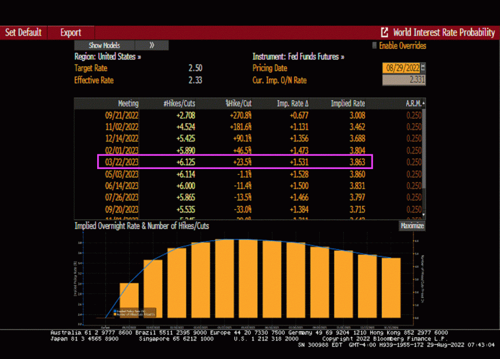 Oddly, the Fed Funds Futures market wasn’t rattled by Powell’s announcement at Jackson Hole. The Fed’s target rate is 2.50% and is expected to rise to 3.863% by March then cool-off. The Cleveland Fed’s Mester said 4% then keeping it at 4% for an extended period of time.