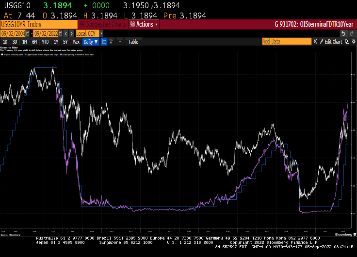 Swaps traders are pricing in a slightly better-than-even chance that the central bank will continue lifting its benchmark rate by three-quarters of a percentage point on Sept. 21 and tighten policy until it hits about 3.8%. That suggests more downside potential for bond prices because the 10-year Treasury yield has topped out at or above the Fed’s peak rate during previous monetary-policy tightening cycles. That yield is at about 3.19% now.