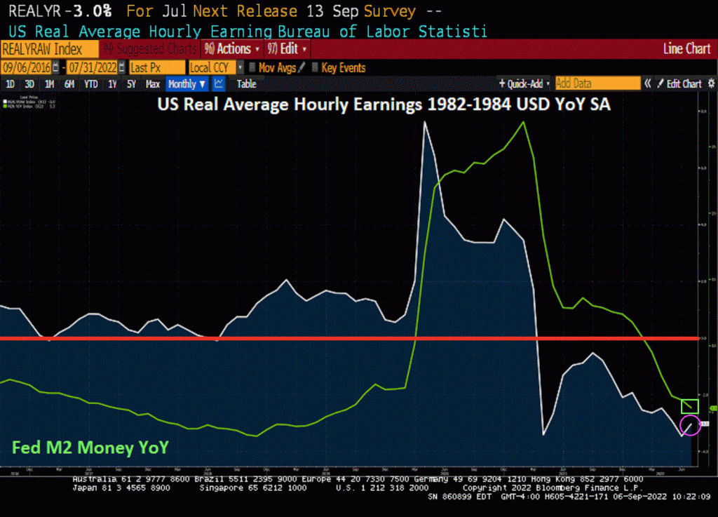 But seriously, the US U-3 unemployment rate is 3.7% in August, the lowest since Donald Trump was President and BEFORE the Covid outbreak. The Covid economic shutdown saw a surge in the unemployment rate to 14.7% in April 2020 that begat a huge spike in M2 Money growth (22% YoY in May 2022 (green line). Only now is M2 Money growth returning to Trump-era growth rates.
