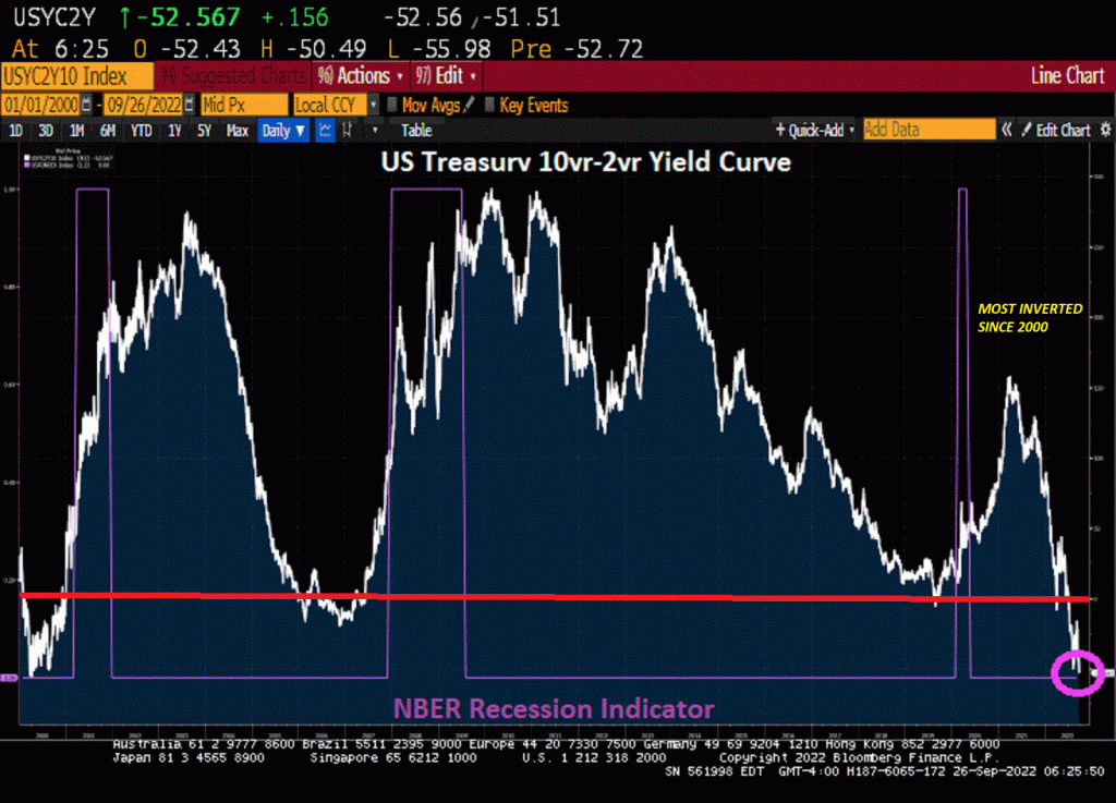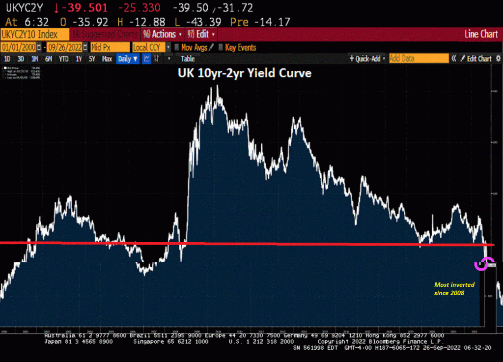 Then across the pond, the UK sovereign yield curve is also inverted. But this curve is only inverted to 2008 levels of The Great Recession. The UK 2-year sovereign yield is up over 50 basis points this morning.