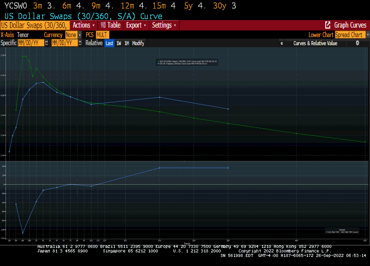 Then we have the US Dollar Swaps curve (green line), steeply UPWARD sloping until 6 months, then declining. The same goes for the US Treasury Actives curve (blue line), except that is it steeply upward sloping out to 1 year then begins declining.