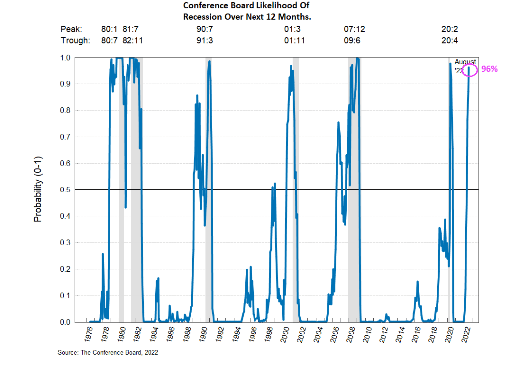 And with rising US job cuts, we are seeing an increase in the probability of a US recession over the next year. But the Conference Board predicts a 96 percent likelihood of a recession in the US within the next 12 months.