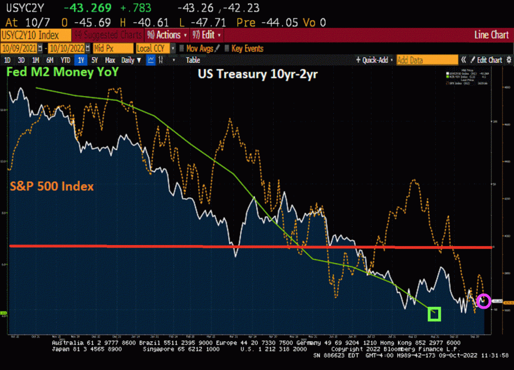 And with the withdrawal of monetary stimulus comes the slowdown of US M2 Money growth (green line). And with that slowdown, we see a declining stock market and an inverted US Treasury yield curve.