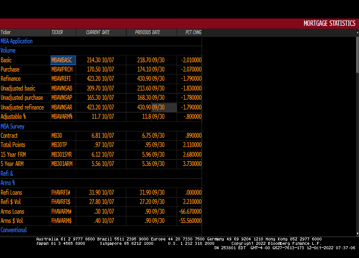 Mortgage applications decreased 2.0 percent from one week earlier, according to data from the Mortgage Bankers Association’s (MBA) Weekly Mortgage Applications Survey for the week ending October 7, 2022. As mortgage rates soar with Federal Reserve tightening.
