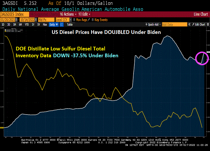Diesel, the lifeline of the shipping industry, is UP 100% under Biden (that is, diesel prices have doubled) while the inventory of diesel fuel has declined by -37.5% under Biden.
